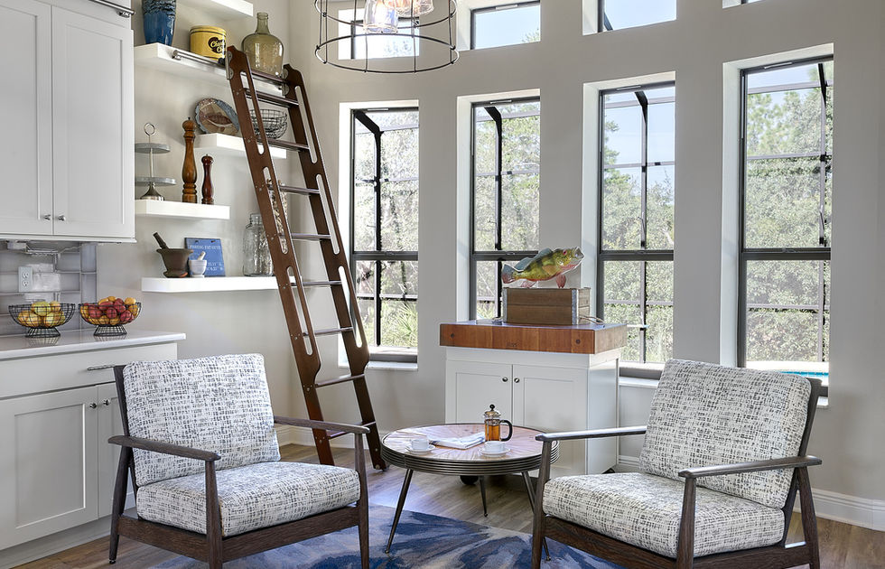 A family's dream for a fishing retreat on the Crystal River came to a reality when they found this hidden gem. The home was in need of an update that would be practical and comfortable for their young family to kick-back in style. Artwork from local artists, their private collection and even some family art and photography adorn the walls. It has two levels with two distinct needs, so we mixed up the style to give each it's own essence, with the top level a bright, fresh, mid-century coastal vibe while downstairs evokes an Old-Florida fish camp feel with rustic textures and embracing deeper tones. We used durable materials and "kid friendly" fabrics to really allow them to relax on both levels. Fun antiques, bench-made furniture, local crafts and lush, live plants finish things off to complete this coastal getaway.